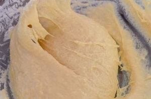 Now you need to briskly work the dough with your wooden spoon. You are going to stir/beat for about 15 minutes to reach the right consistency. The right consistency is when the dough forms bubbles that take 1-2 seconds to collapse. See picture below. This takes experience to get right. At this point your dough has “structure”. It will be similar to a sourdough.