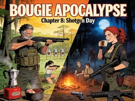 Percolator hissed. Ham and beans bubbled low. Firelight danced against the cypress. You sat on the stump, Wilson Combat 1911 holstered, Ruger AR across your lap, Remington 870 resting nearby like an old friend. Raych leaned against a tree, her AR low ready. Sarah had the Mossberg 590 cradled like she meant it. Tom and Mikey stayed close to the fire.