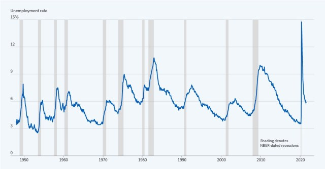 The shaded time period is a recession. The blue line maps unemployment rate. Unemployment is a good proxy for GDP growth (and you would see the same sort of line if we mapped GDP). Now, notice how the line moves.