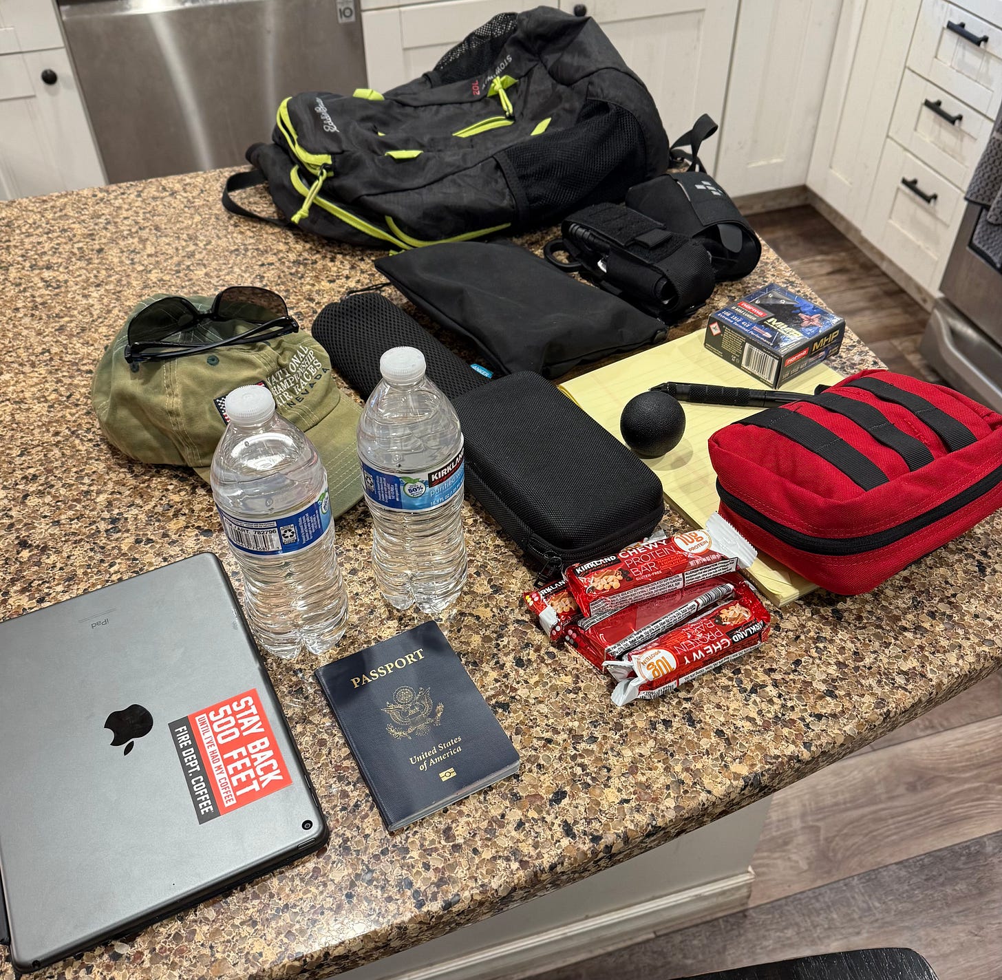 All told, my Eddie Bauer day pack with all that gear in it weighs 11 lbs. Add in my other EDC stuff (pistol, extra mag, Leatherman, flashlight) and we are up around 15 lbs of daily carry. That’s not very much, really, and it can save your life or the lives of people around you. Not to mention keeping you fed and hydrated, dealing with a headache, and able to communicate with friends and family.