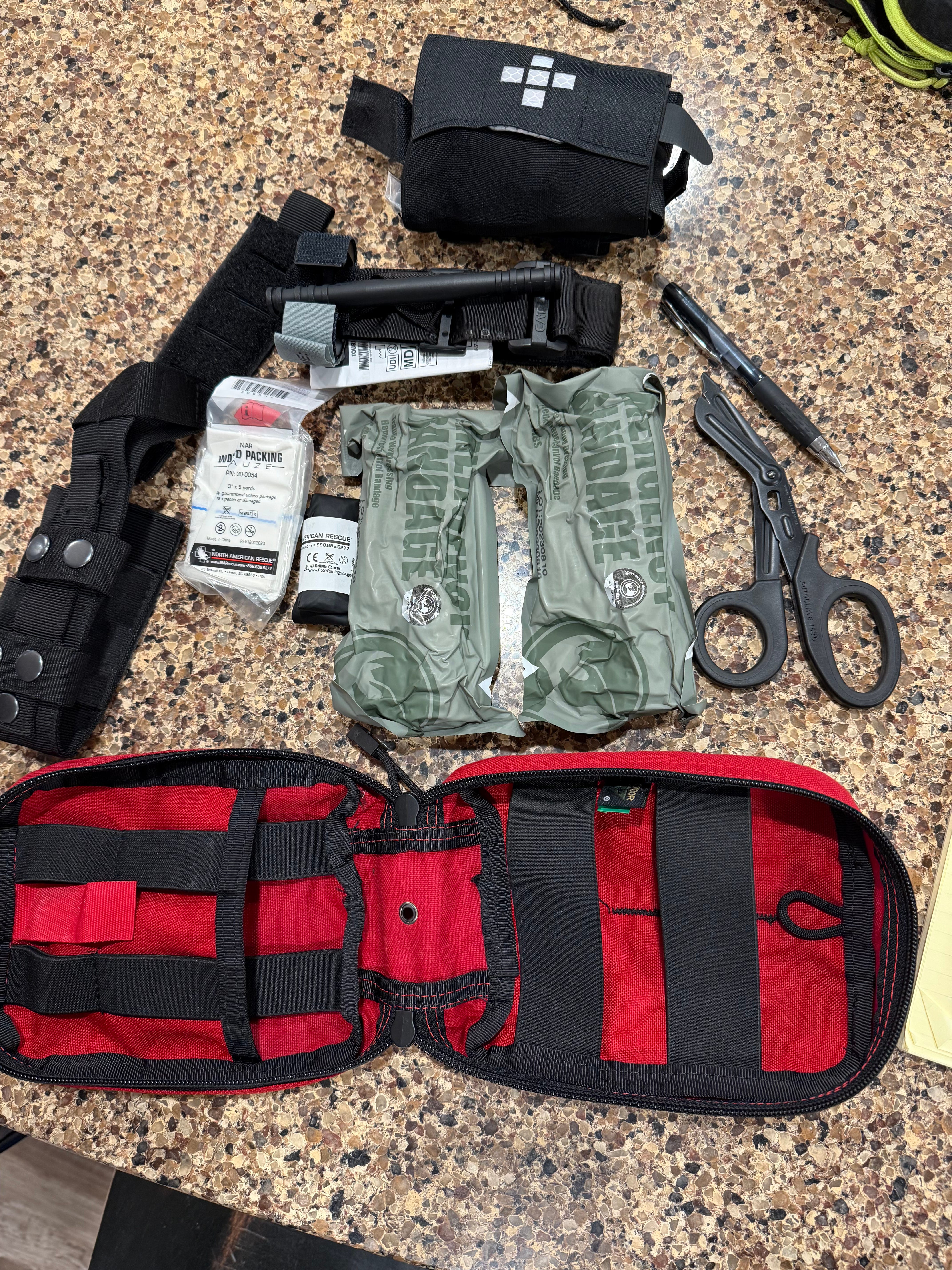 I have a Tacticon IFAK V1, Condor EMT Pouch, 2X NAR 6” Pressure Bandages, Nitrile gloves, gauze, TQ Holder, NAR CAT tourniquet, NAR trauma shears, and black ink pen. You can treat just about any injury or wound with this. It’s not quite the combat lifesaver bag we had in the Army, but it’s got me covered for most situations I will encounter. I have two tourniquets (one is in the IFAK) and two bandages because you never apply your own to someone else.