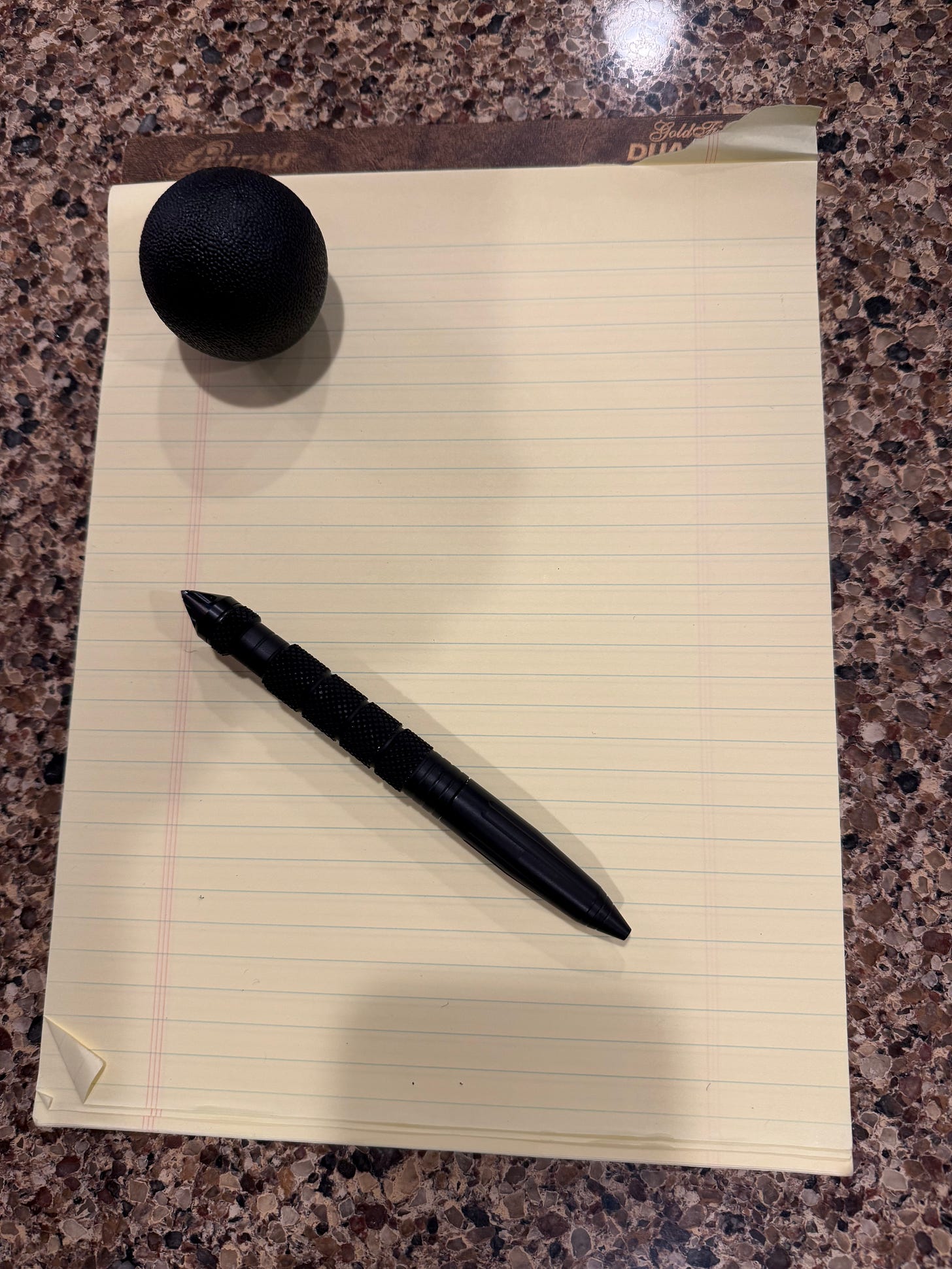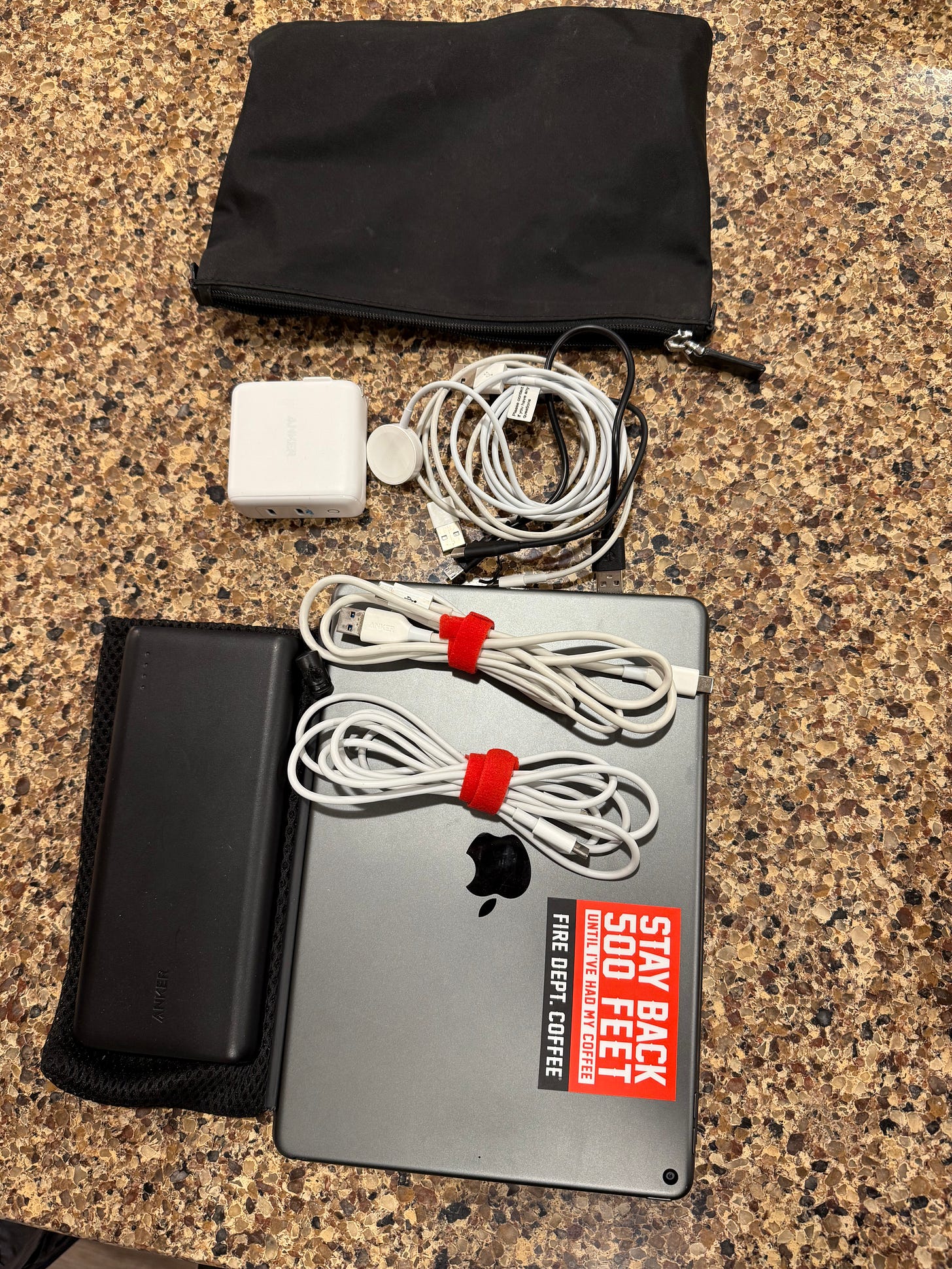 My office supplies include a yellow notepad, a squishy ball, an Atomic Bear pen (I can break windows with it, not just write), a wall charger and a bunch of cables for iPhone, iPad, and watch, an Anker battery that can charge my devices a couple times over, my iPad with keyboard, and a pouch to keep all the cables in.