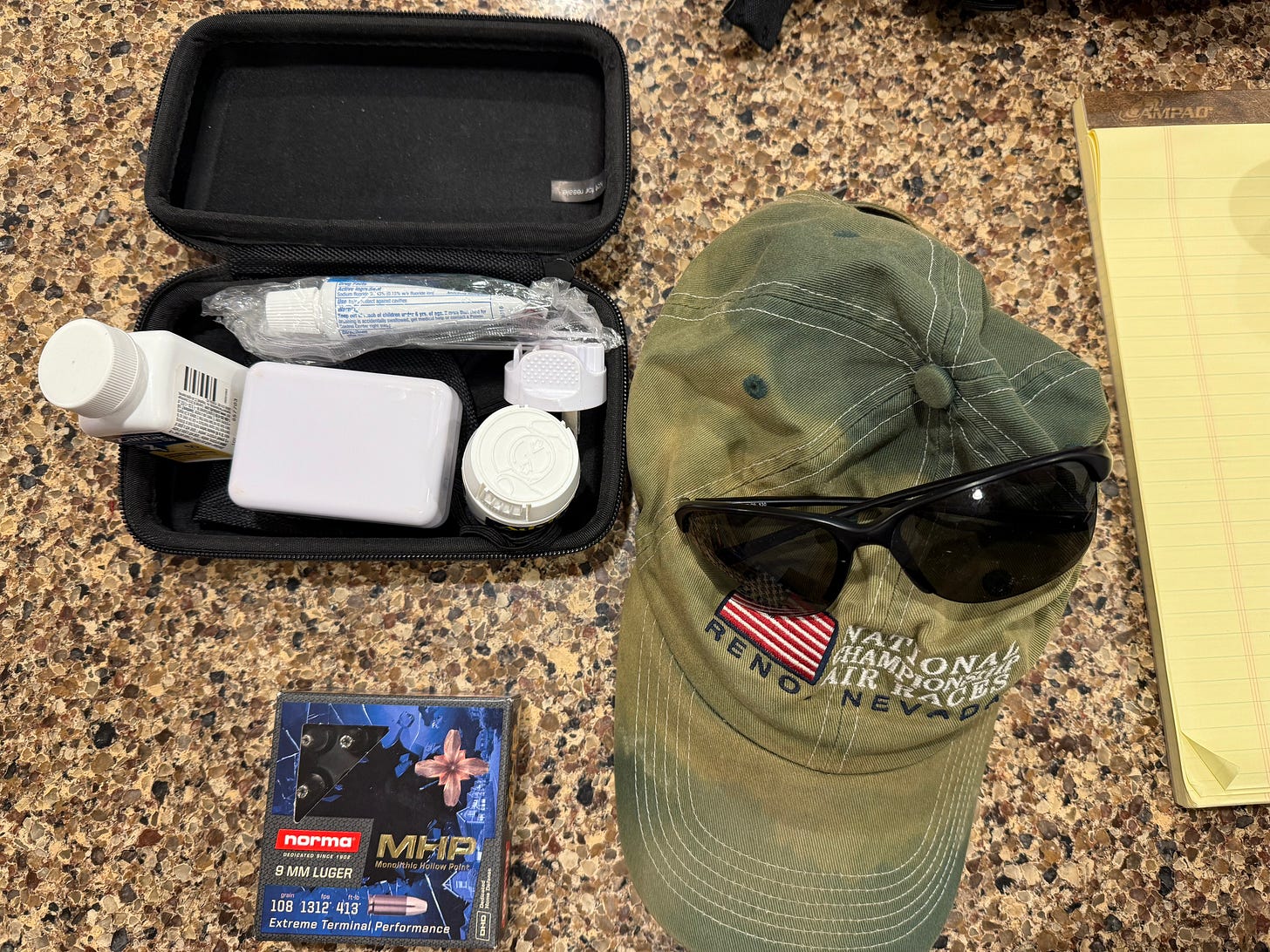 I always have a ball cap, sunglasses, toothbrush and toothpaste, Tylenol and ibuprofen, and gloves with me. The gloves are Magpul Patrol gloves, in case I need them and they are also better than no gloves if I am out in the cold/wet. And I carry an extra box of self-defense ammo. My normal EDC pistol is a Springfield Armory 1911 Ronin EMP 4” with 2x 10 round magazines and so I carry an extra 20 rounds with me. Just cause you never know.