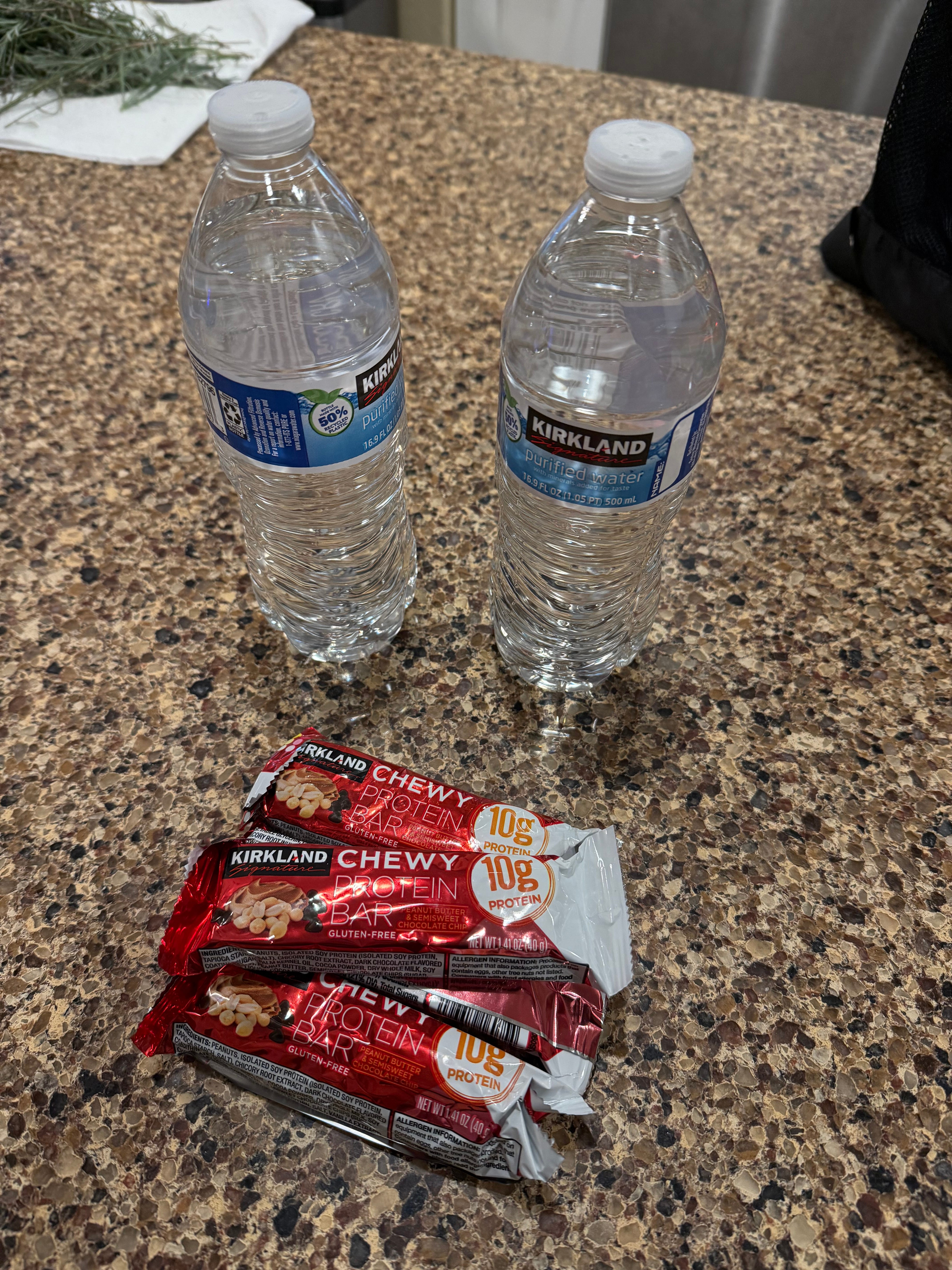I keep this pretty straightforward, just a liter of water and 4 protein bars. That’s a total of 800 calories and enough water to not get dehydrated during the day. I can also use the water for first aid, if I need to.