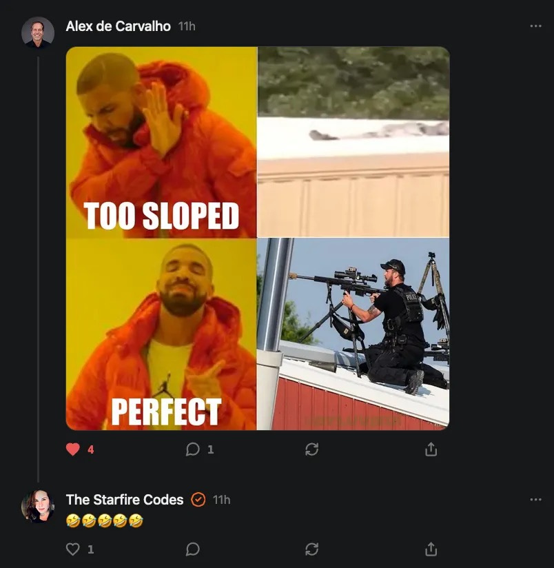 Welcome to a post that is nothing but memes. Director of the Secret Service, Kimberly Cheatle, suggested that her agents weren’t on the roof where the shooter who attempted to assassinate Trump were at because the roof was sloped and that was a safety issue.