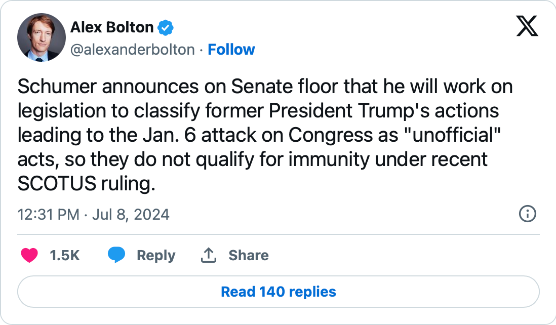 What was important on a broad scale, grand scheme of things perspective, is that the Supreme Court was clearly trying to head off the Late Republic style lawfare with a formal decision that instantiates the precedent and practice of 240 years of the American Republic. And Chuck Schumer, Senate Majority Leader, is having none of it.
