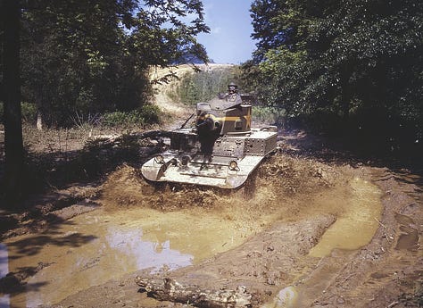That hill you see, with a road going basically straight up, that is one of the three hills at Fort Knox known as Agony, Misery, and Heartbreak. You walk up these hills in full gear as part of your training. And that tank driving in the mud is from WW2, but the driving course hasn’t changed a bit.