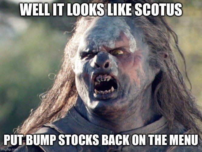 When I first saw the SCOTUS decision in Cargill (the Bump Stock ban case), I had an irreverent thought that made me chuckle and then led to me creating a new meme using everyone’s favorite Orc talking about meat on the menu.