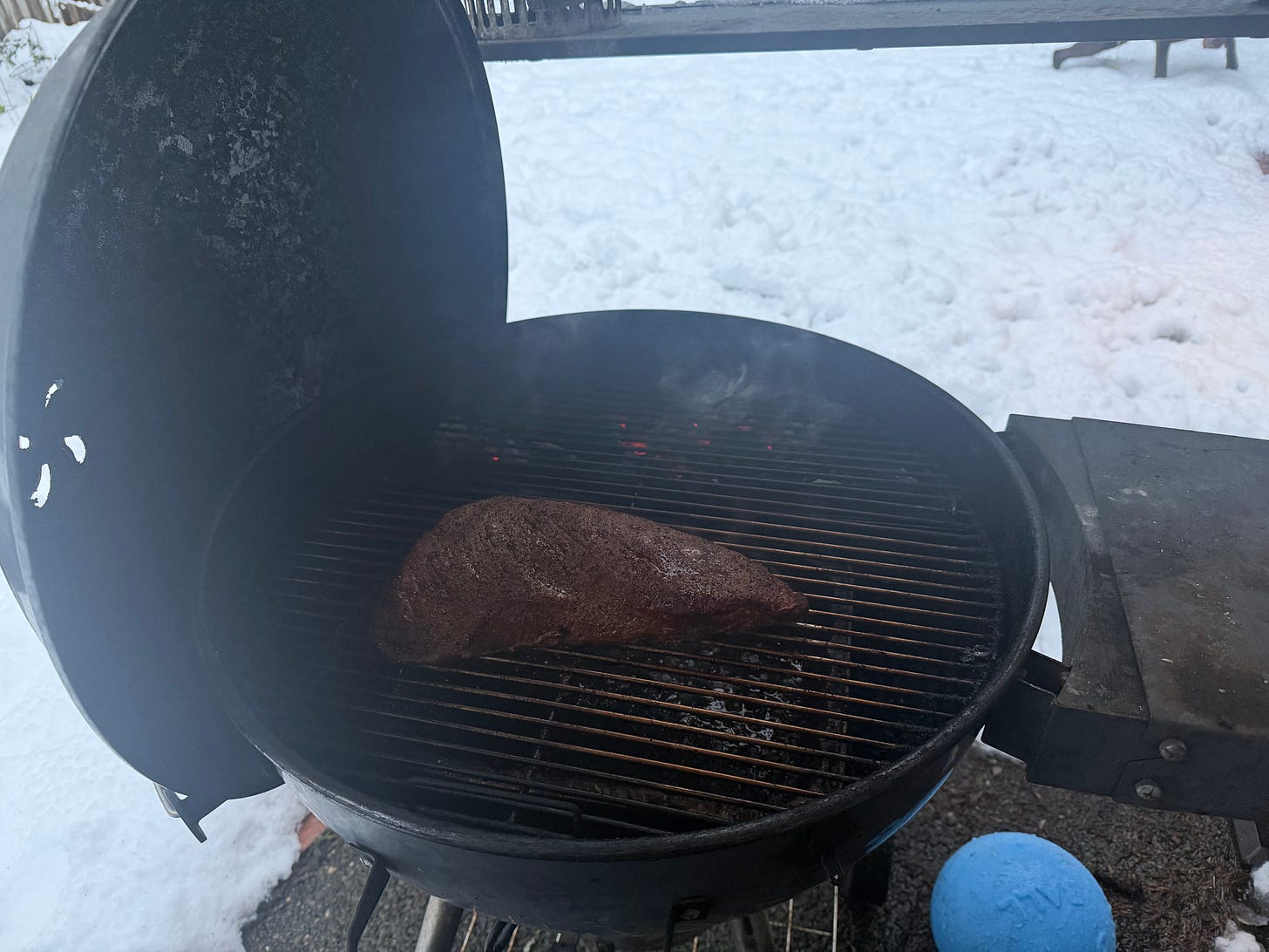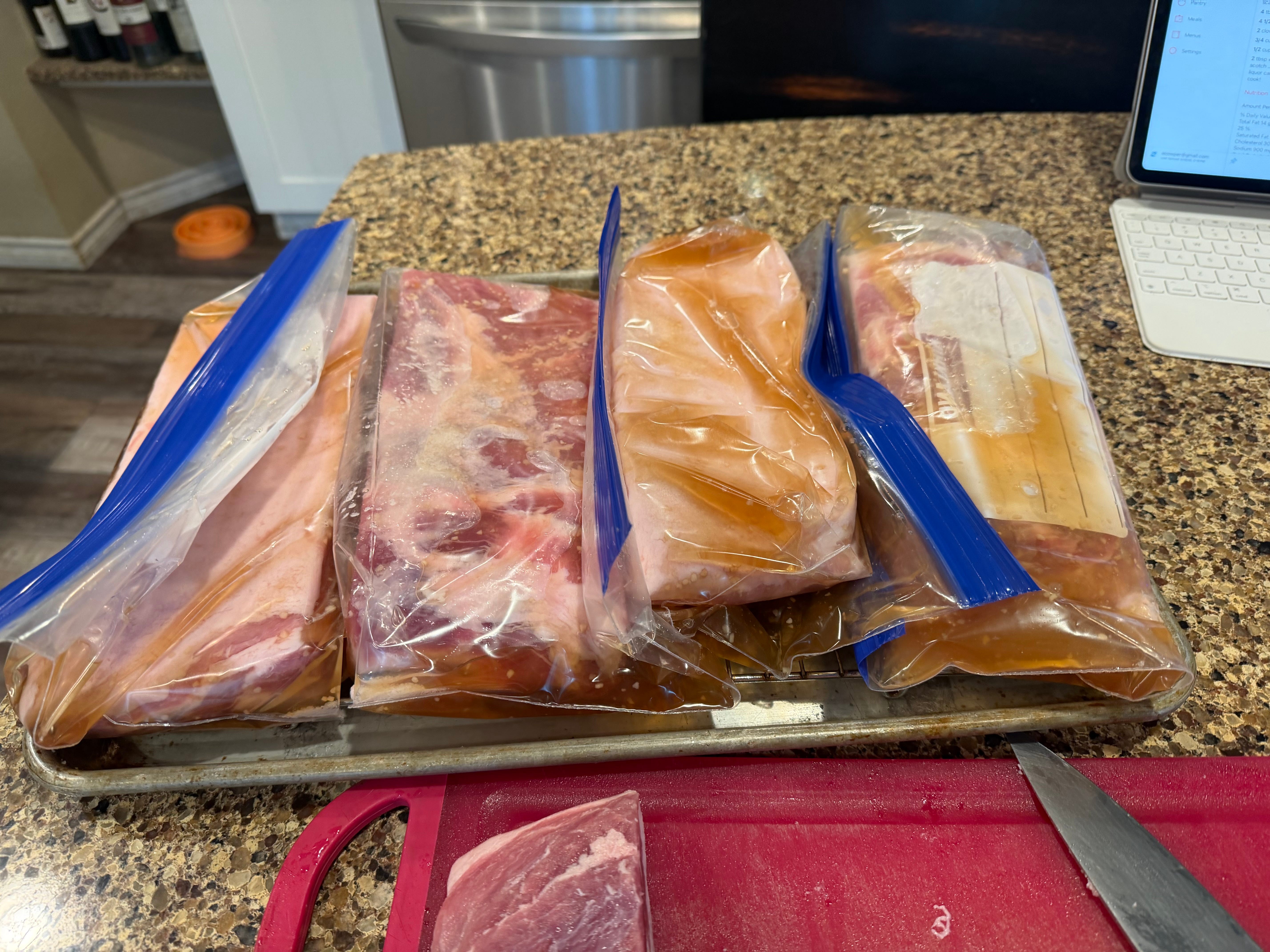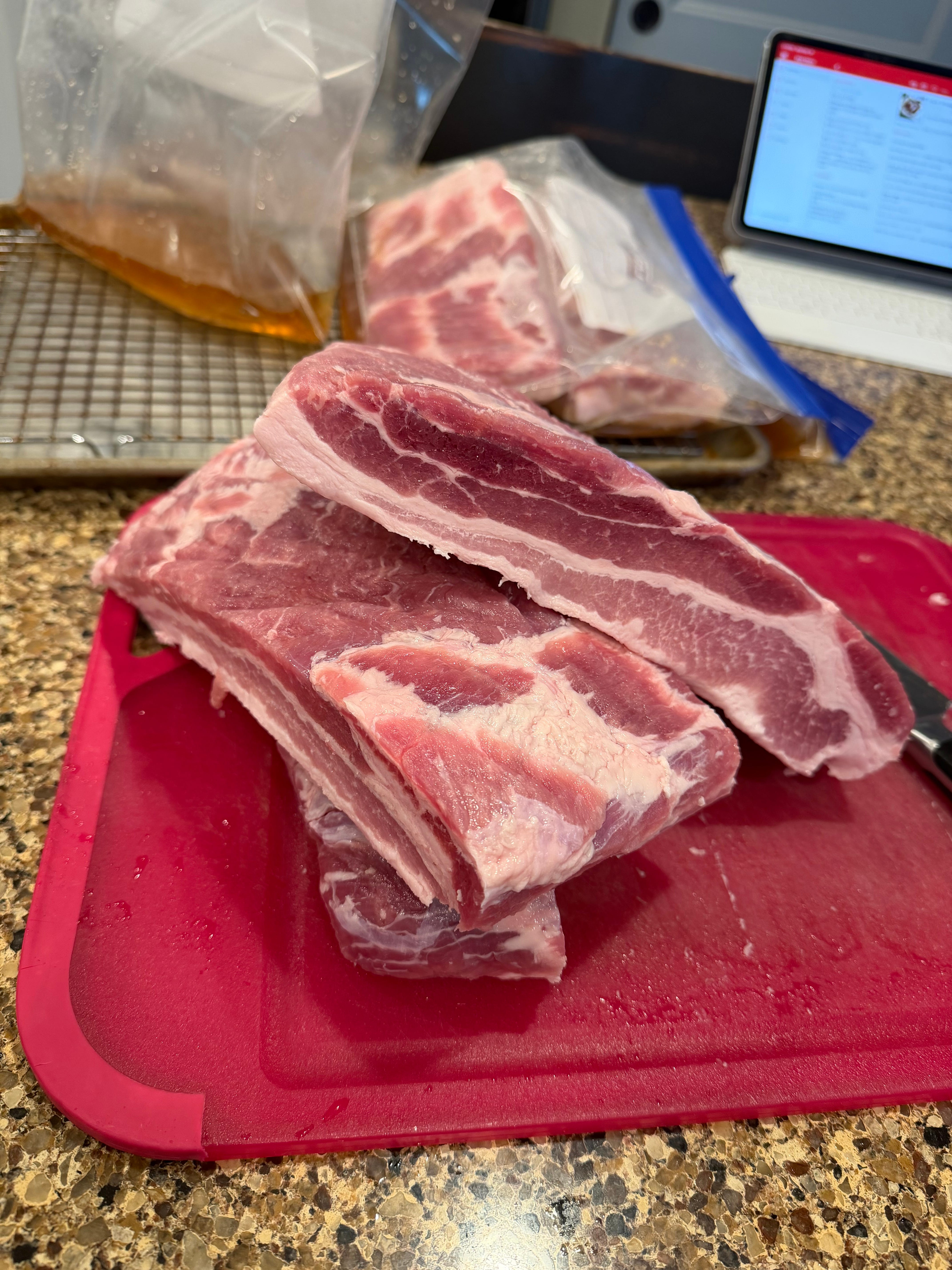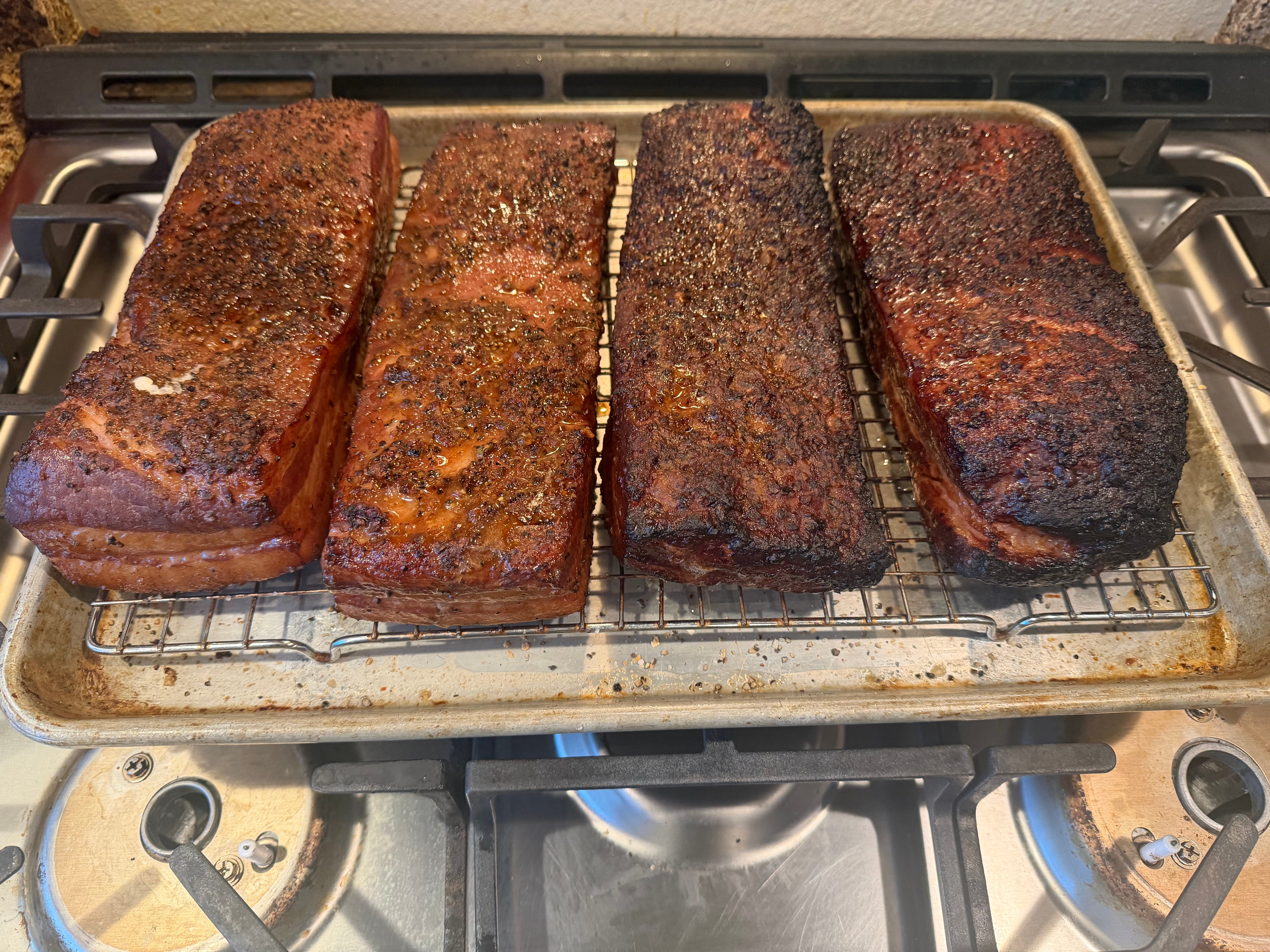 Knowing nice weather was coming, I pulled a pork belly out of the freezer on Tuesday — Still tons of snow on the ground — and broke it down into four 2-pound slabs (with another 1.5 lbs left in the freezer for future belly burnt ends). Those slabs went straight into a maple-whiskey cure so they’d be ready to smoke on Sunday.