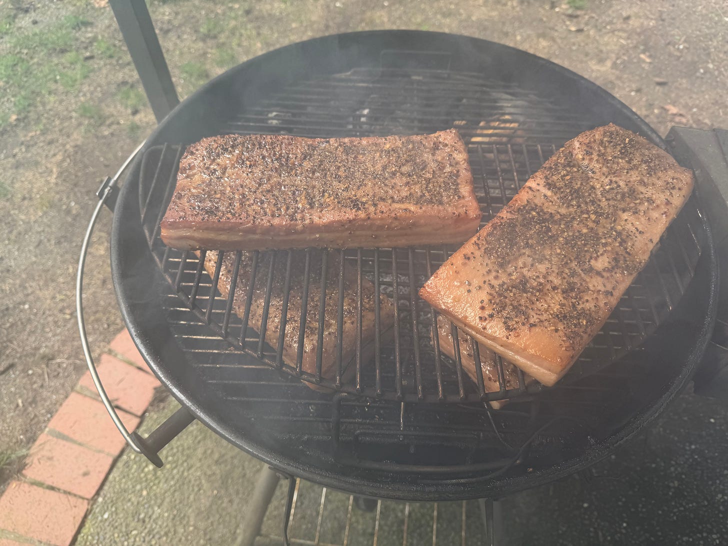 Set up your grill/smoker for indirect cooking and stabilize between 225–250°F. Add fruitwood or oak and get the smoke rolling well, then put the pork belly on. Smoke the cured belly until it reaches an internal temperature of 155–160°F and has a nice bark (about 2½–3 hours).