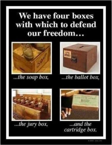 Frederick Douglass taught that a free republic rests on four essential boxes: the soap box (free speech), the ballot box (voting), the jury box (fair trial), and the cartridge box (the right to keep and bear arms).